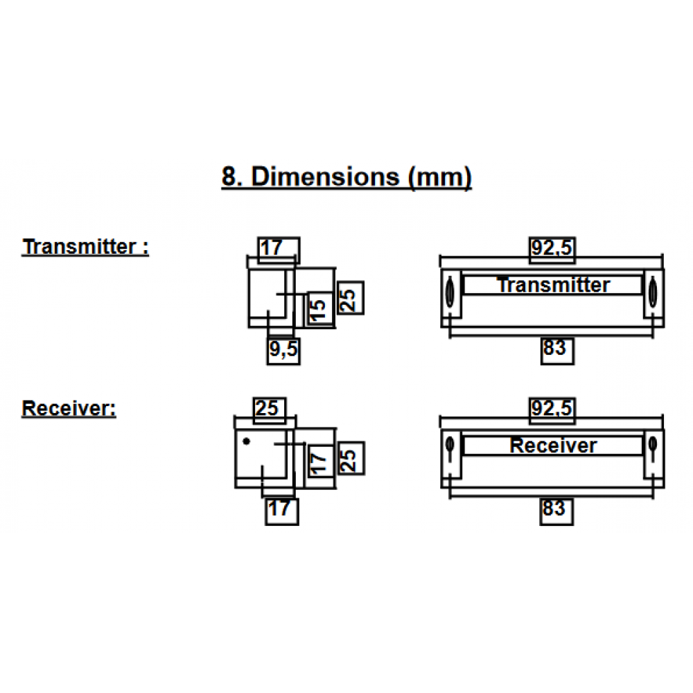 | Size | Transmitter: 92,5 x 17 x 25mm Receiver: 92,5 x 25 x 25mm |